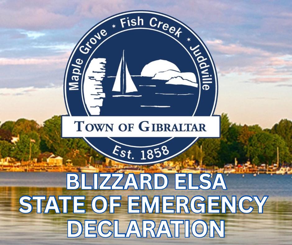 Due to the severe conditions created by Blizzard Elsa, the Town of Gibraltar has declared a State of Emergency. Emergency response capabilities are currently severely limited due to extreme snowfall, drifting, and blocked roadways.